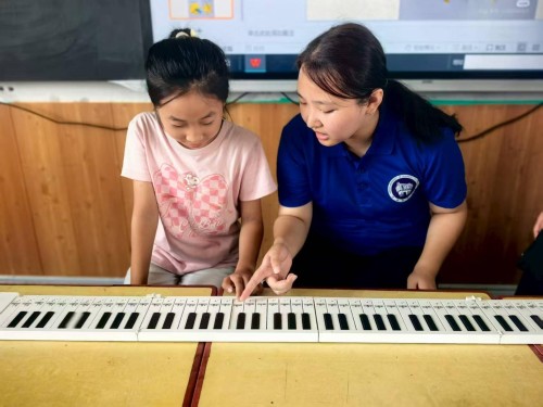 图为宣讲团成员宋昱璇指导孩子们学习钢琴。大学生网报通讯员孙佳伦供图
