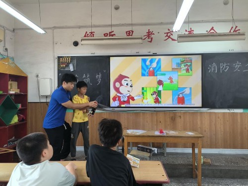 图为宣讲团成员宫师伟带领孩子们进行灭火器演练。大学生网报通讯员孙佳伦供图