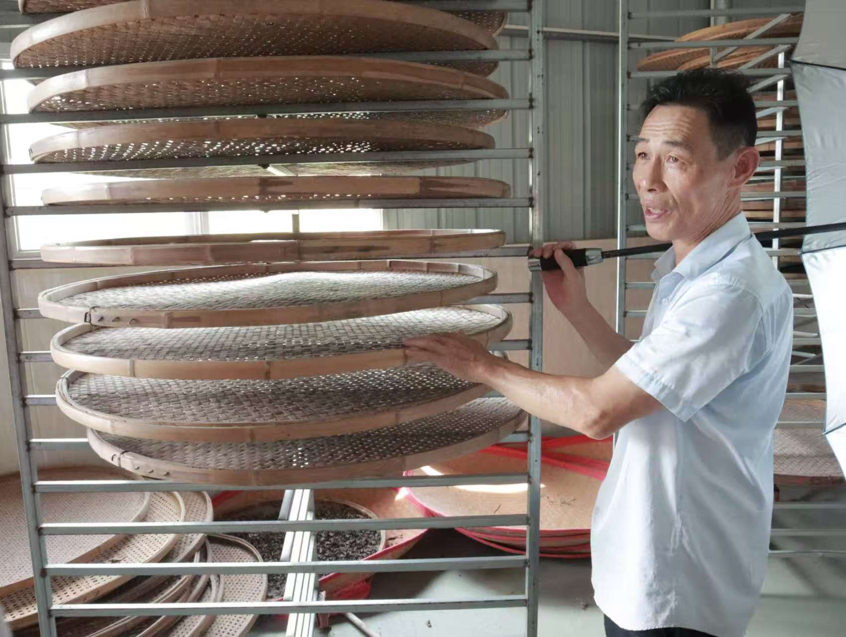 图为茶老板向队员们介绍制茶用到的竹制晒匾