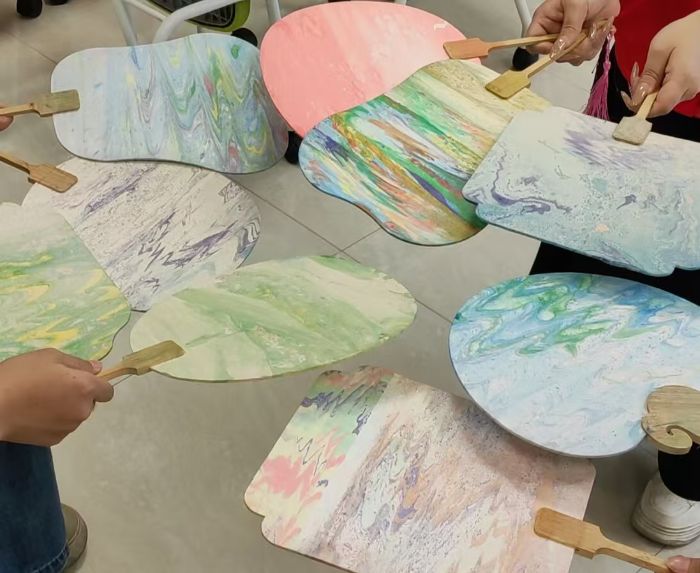图为学生们的创意漆扇作品展示