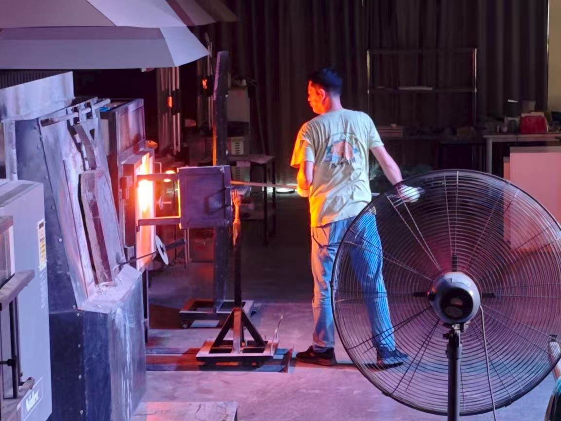 接下来朱老师用吹杆展示吹制的奥秘,老师举起吹杆,吹入几口仙气,再借助旧报纸塑形,一个盘子就在我们面前成型,轻轻一敲便从吹杆上分离下来。演出结束后,队员们对朱老师进行了一次简单采访,了解到匠人们在琉璃创作上极其严谨,从原料的配比到力度的掌控都亲力亲为并且精益求精。