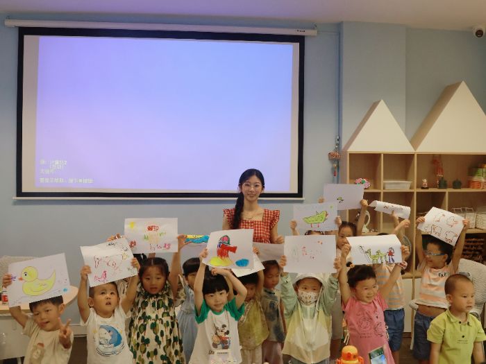 故事逐渐落下帷幕,小朋友们早已按捺不住创作的兴致,纷纷化身故事里的创意小鸭,专注地用鸭子脚印绘制出生动的图画,有的将脚印当作枫树的叶子,有的将脚印画成一条条灵动的小鱼,在画纸上重现鸭子们用脚印作画的奇妙场景,也将自己的奇思妙想融入其中。活动尾声,小朋友们自豪地展示着自己的绘画作品,灿烂的笑容与充满童趣的创作相映成趣,为这场充满智慧启迪的绘本之旅画上了圆满句号。