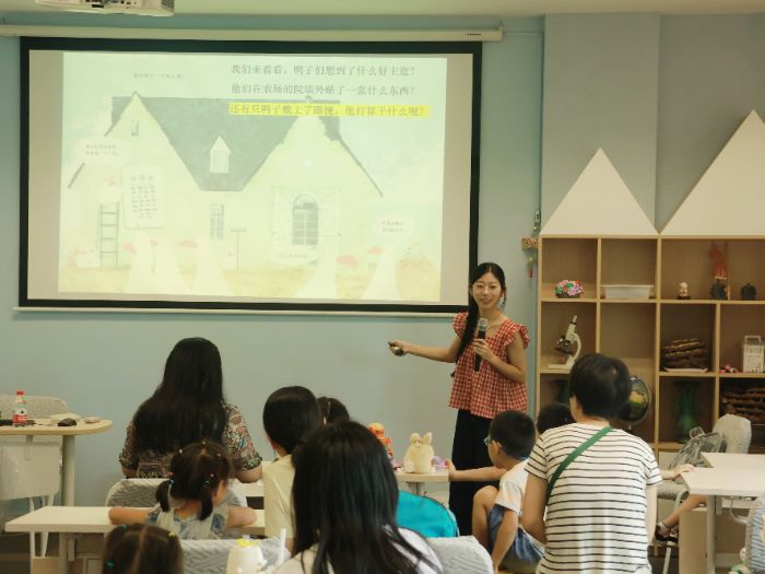 课程以一场生动有趣的《数鸭子》手势舞教学拉开序幕,小朋友们在周涛的带领下,兴致勃勃地跳起活泼可爱的手势舞,稚嫩的动作和欢快的笑声为课堂注入了满满的活力。热身完毕,小朋友们的目光聚焦到了绘本《价值100万的好主意》上。在周涛绘声绘色的讲述中,大家跟随一群失去农场主人的小鸭子,踏上了充满波折与惊喜的智慧之旅。