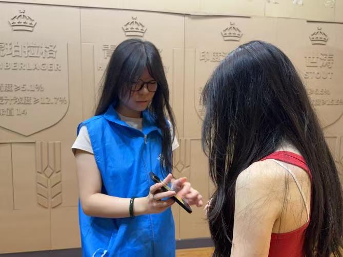 7月15日,实践队前往薛家岛街道,采用“分众化调研”策略,兵分多路分发调查问卷。在车水马龙的繁华商圈,队员们向往来游客与市民细致讲解调研目的,重点收集不同地域人群对青岛酒文化的认知画像;走进社区广场,则将目光投向常住居民,深入探寻中老年群体对传统酿造工艺核心价值的理解,那些口耳相传的匠艺细节,在调研中凝结为珍贵的文化记忆。