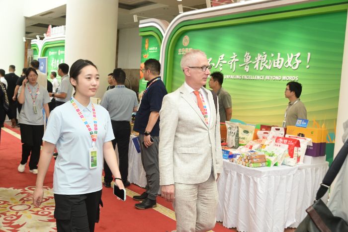 7月25日,志愿者在山东大厦金色大厅全力保障会议:分发材料、引导嘉宾入座、提醒会议安排;在展示区用双语讲解智能农机与减损成果,精准翻译专业术语,助力中外交流顺畅。