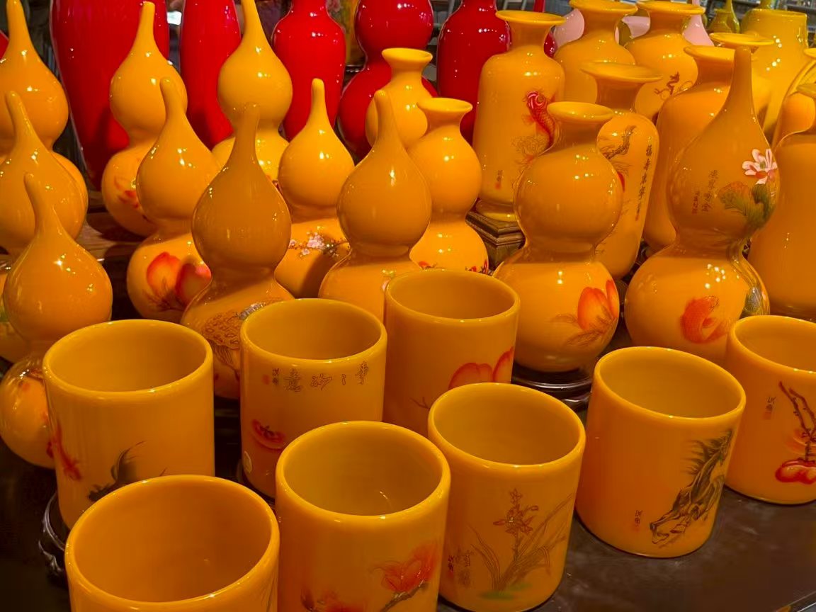 随后,实践队移步至成品展区,眼前的景象令人惊叹:展区内不仅有各类逼真的琉璃植物、憨态可掬的琉璃小动物,还有高度还原淄博烧烤场景的琉璃作品,各类作品的细节刻画细腻逼真、每一件琉璃展品都栩栩如生。讲解员特别介绍了园区最具代表性琉璃--鸡油黄,其以温润如凝脂的色泽和细腻的质感为特色,是最为昂贵的一种琉璃,也是最能代表淄博特色的一种琉璃。