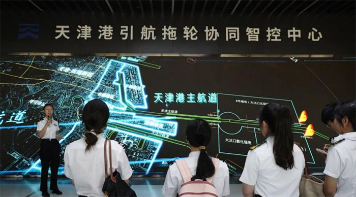 在天津引航中心拖轮协同智控中心,实践队见证了“四同+四统”模式的智慧调度革命。该系统依托数字孪生技术构建虚拟港口场景,通过AI算法实时优化船舶引航路径,实现引航效率提升13%。屏幕上实时跳动的“引航6+2效率指标体系”,让队员直观感受到数据驱动下引航、拖轮与码头“三位一体”的无缝协作。“这不仅是效率变革,更是安全壁垒的智能化升级。”技术负责人强调。