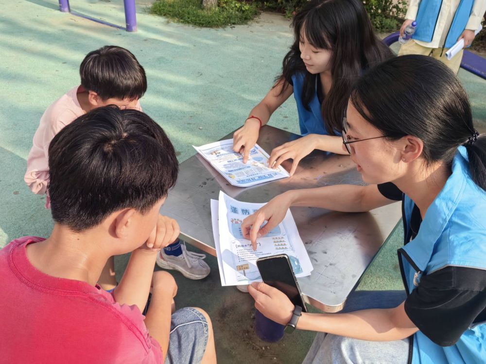在“银发反诈”方面,志愿者“面对面”与社区老人交流,用方言讲解典型骗局,揭露常见诈骗手段。同时,志愿者还手把手教老人设置手机支付安全、识别诈骗信息,增强老年人的反诈骗能力。“童心防溺”则聚焦社区儿童,团队成员通过发放防溺水安全知识手册,集中向社区儿童讲解防溺水“六不准”原则,以知识问答的形式让防溺水安全教育知识牢牢记在孩子们的心中。