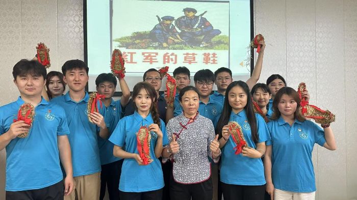 7月29日下午,实践团走进井冈山红色民俗馆,跟随专业的两位老师傅学习编草鞋。伴随着“穿上草鞋走路沛,险山河水当平道”激昂旋律,老师傅捧着棕绳、稻草演示技法。 队员们试着搓绳、编底,却因绳结松散频频返工,老师俯身指导:“编草鞋要把经纬拧实,就像革命信念不能松。” 现场传来窸窣的草绳摩擦声,大家攥着粗糙的草鞋半成品,深刻领悟到红军自力更生、坚韧不拔的精神,让红色技艺在指尖复活。