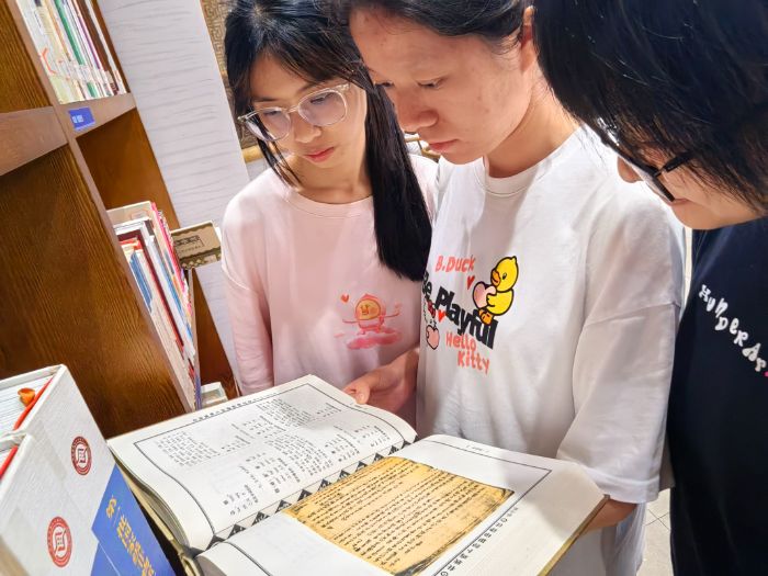 7月5日,“壮典薪火调研团”前往广西民族博物馆进行参观调研。广西民族博物馆在古籍的保护、研究与传播中占据着不可替代的地位。“壮典薪火调研团”探访的目的正是为了,挖掘国籍中蕴含的民族智慧,记录古籍修复的珍贵经验。在博物馆的古籍修复工作室,调研团成员亲眼目睹了一场跨时空的“文化救治”。工作人员介绍,馆内珍藏的壮族古籍因年代久远、材质特殊,大多面临着虫蛀、霉变、纸张脆化等问题,尤其是贝叶经与手抄本,修复难度极大。为此博物馆组建了专业的修复团队,融合传统技艺与现代科技,为古籍“续命”,这修复古籍的决心,让调研团成员深刻体会到“修旧如旧”背后的匠心与坚守。