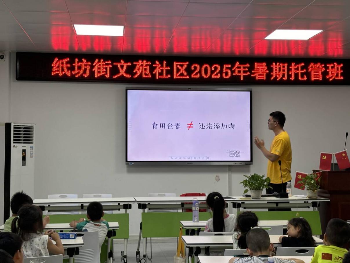 7月29日下午,一场别开生面的食品安全科普课在武汉市江夏文苑社区热烈开讲。华中农业大学食品科学技术学院“食品安全与营养中国行”博士团成员们化身“色彩魔法师”,为二十余名小学生带来了主题为“抓住‘隐形调色盘’—— 带你破解食品色素的魔法和秘密”的趣味科普课。课堂上,孩子们踊跃参与,笑声与惊叹声此起彼伏,共同开启了这场探索食物色彩奥秘的神奇之旅。
