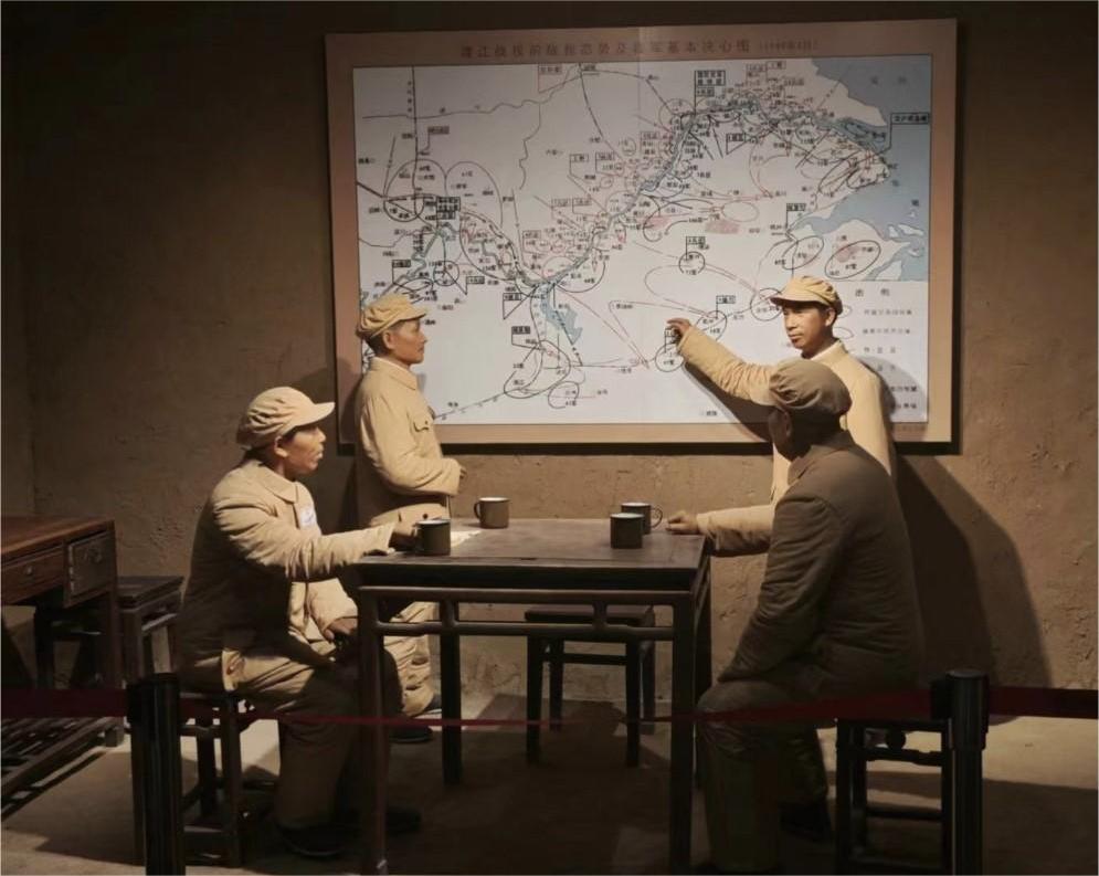 在历史文化陈列的当代部分,渡江战役总前委员会孙家圩子旧址会议室蜡像尤为醒目。志愿者们了解到,1949年3月22日至4月5日,邓小平、陈毅、谭震林、粟裕等在此主持会议,部署渡江作战、制定《京沪杭战役实施纲要》,并决定组建我军第一支海军部队。解放后,蚌埠人民在党的领导下,依托资源与交通优势团结奋斗,逐步将城市建设为皖北工业基地,在探索中推动社会主义建设不断前行。