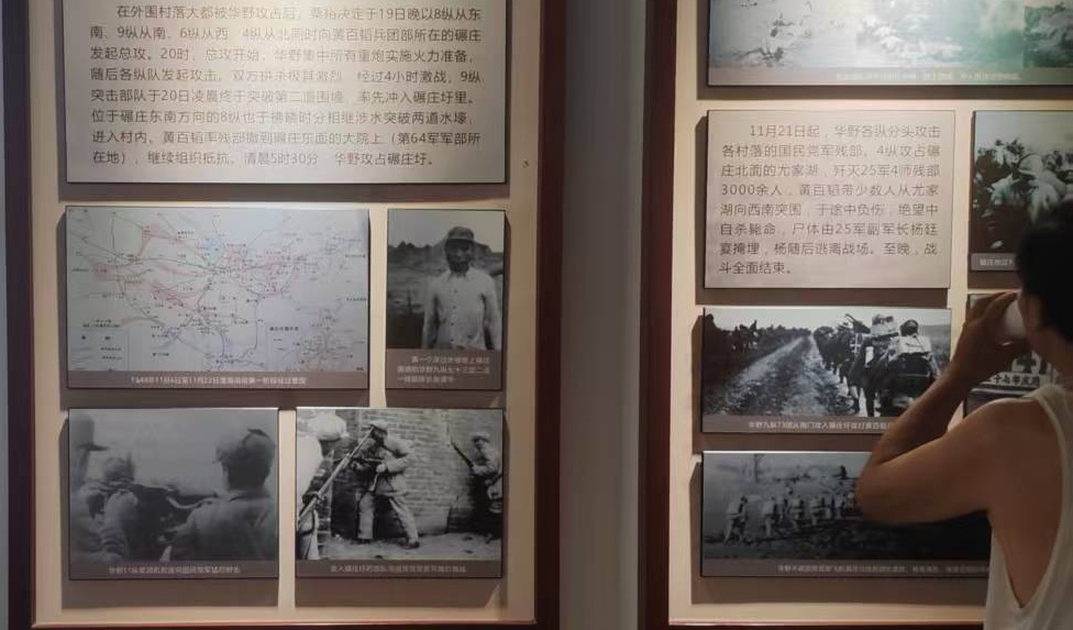 在拍摄过程中,一位老人引起了刘锦怡的注意。老人驻足凝视战役展板,还不时与同行好友低声讨论。“这场战役打的不容易啊……”他的话语中透着对战役的深刻理解。经过交谈得知,老人是当地退休教师,对淮海战役有着深入研究。“年轻人来做这个工作很有意义,”老人对实践团的工作表示赞赏,“把历史用新技术保存下来,才能让后代永远铭记。”