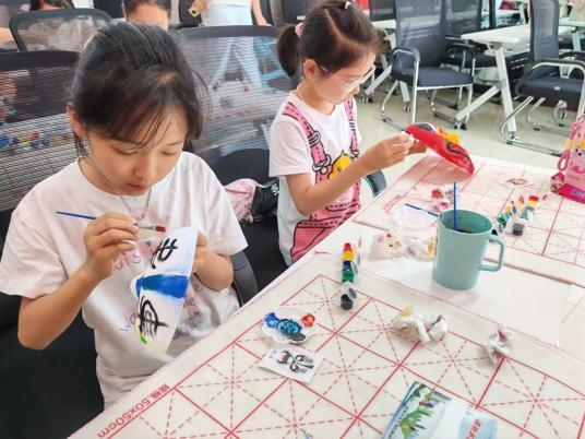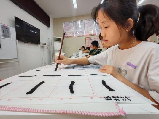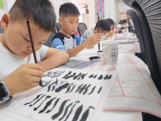 书法体验让传统文化更添一份静气。大学生志愿者手把手教孩子们握笔站姿,"横如大地,竖似青松"的讲解中,毛笔在宣纸上落下第一个"一"字。孩子们屏息凝神,有的反复调整笔画弧度,有的认真擦拭重写,稚嫩的笔迹透着专注。志愿者们耐心指导每个细节,从运笔力度到结构布局。当歪扭的"人"字渐渐成形,孩子们眼中闪着光,在横竖撇捺间不仅触摸到汉字之美,更体会到"端端正正写字,堂堂正正做人"的文化深意。墨香氤氲中,一场静心的文化修行悄然完成。
