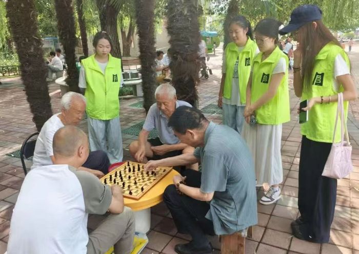 在休闲娱乐环节,实践团充分考虑老人的兴趣爱好,精心策划了多样化活动。棋艺角里,队员们主动邀请象棋爱好者“一决高下”,在楚河汉界的博弈中,巧妙引导老人思考布局,既锻炼了老人的思维能力,又通过幽默的话语缓解对弈的紧张感;跳棋桌上,成员们耐心指导老人移动棋子,鼓励他们尝试新策略,欢声笑语此起彼伏。同时,实践团发挥专业优势,针对老年群体易遭遇的诈骗问题,通过情景模拟、典型案例分析、防骗口诀教唱等形式,将防诈知识融入趣味互动。老人们踊跃参与问答,积极分享身边见闻,现场学习氛围浓厚。此次活动不仅让老人们感受到社会的关爱,也让实践团成员在奉献中深化了对敬老助老精神的理解,用实际行动为构建和谐代际关系贡献青春力量。