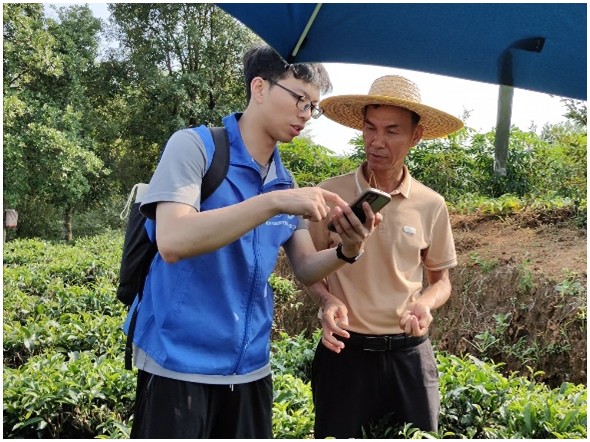 茶山上的绿意里,队员们与茶农一同采茶,指尖翻飞间,“推普+助农”的理念悄然落地。这片茶园要卖到外地,得让收购商清楚咱们的品质优势,普通话就是最好的“推介员”。队员们的话让茶农们频频点头。从农户家中的促膝长谈,到村务公开栏前的细致解读,队员们将调研与服务融为一体,让普通话推广既接“地气”又聚“人气”,在田垄与屋檐间织就一张覆盖生活生产的服务网络。