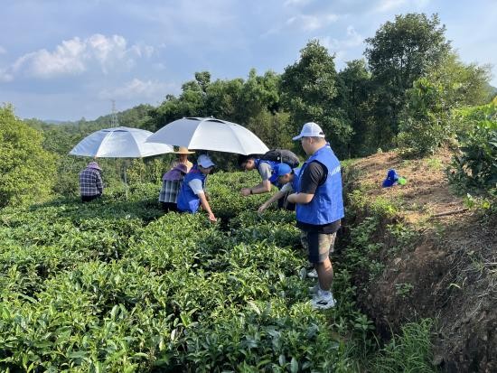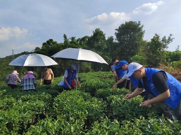 清晨的茶园里,服务队成员与茶农们一同挎着竹篓穿梭在茶树间,指尖轻捻嫩芽的同时,一场别开生面的“采茶普通话课堂”悄然展开,沁人心脾的茶香中,不断传来夹杂着浓重的地方韵味普通话的欢声笑语。针对部分茶农在茶叶采摘、品质描述等方面存在的方言表达障碍,志愿者们结合“一芽一叶”“杀青火候”“回甘韵味”等专业词汇,逐字逐句示范标准发音,让茶农在轻松互动中掌握实用表达。在交流中,我们深深感到,畅通茶叶的销售渠道,是湾岛村广大群众致富的关键需求。
