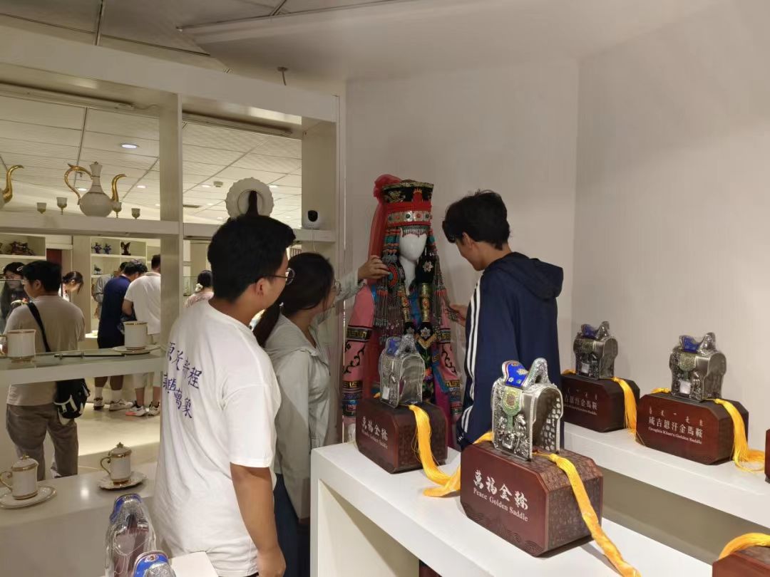 踏入集团展厅,队员们被众多的文创产品深深吸引。这些产品巧妙融合了民族文化元素,将蒙古族的传统图案、色彩和工艺生动展现:以蒙古族传统服饰为灵感设计的时尚饰品,精巧的盘扣与现代金属材质碰撞出独特韵味,将民族风情与潮流感完美融合;民族风情的文创U盘,更搭建起传统文化与现代科技之间的桥梁。实践队队员们不仅亲眼见证了传统文化如何通过创意设计“活”起来,更从荣朝集团的发展模式中,看到了文化资源转化为产业动能的具体路径。