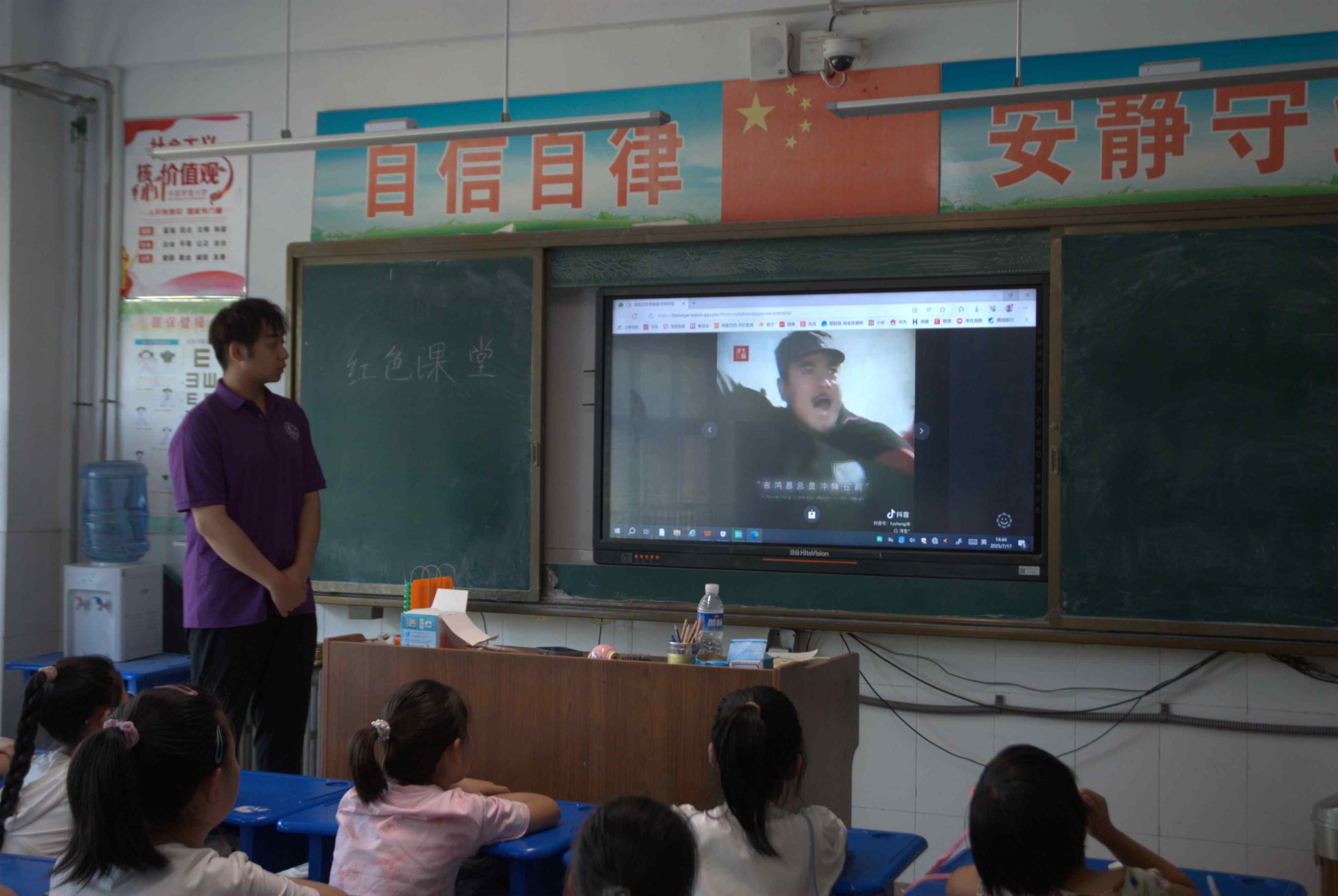 课堂里,实践团成员们以图文的形式向孩子们介绍了多位革命英雄。在向孩子们展示革命先烈英勇奋战的相关红色视频时,炮火掀起的尘土填满视野,冲锋号的声波在教室里回荡,视频的光束映在每张稚嫩的脸上,照出微微颤抖的嘴角和攥紧的手心。一幕幕英勇的画面,在孩子们心里凝成一条滚烫的血脉,使他们对革命先烈更加崇敬。