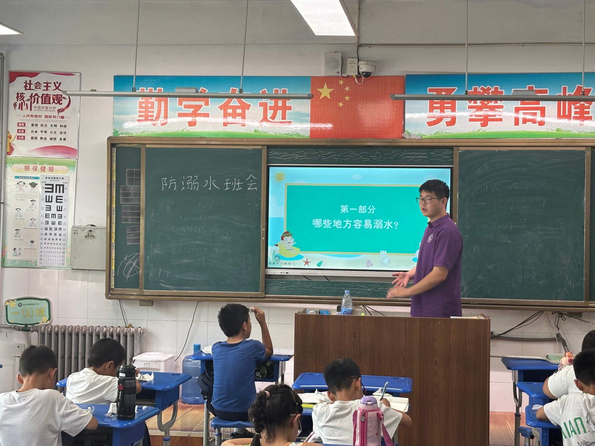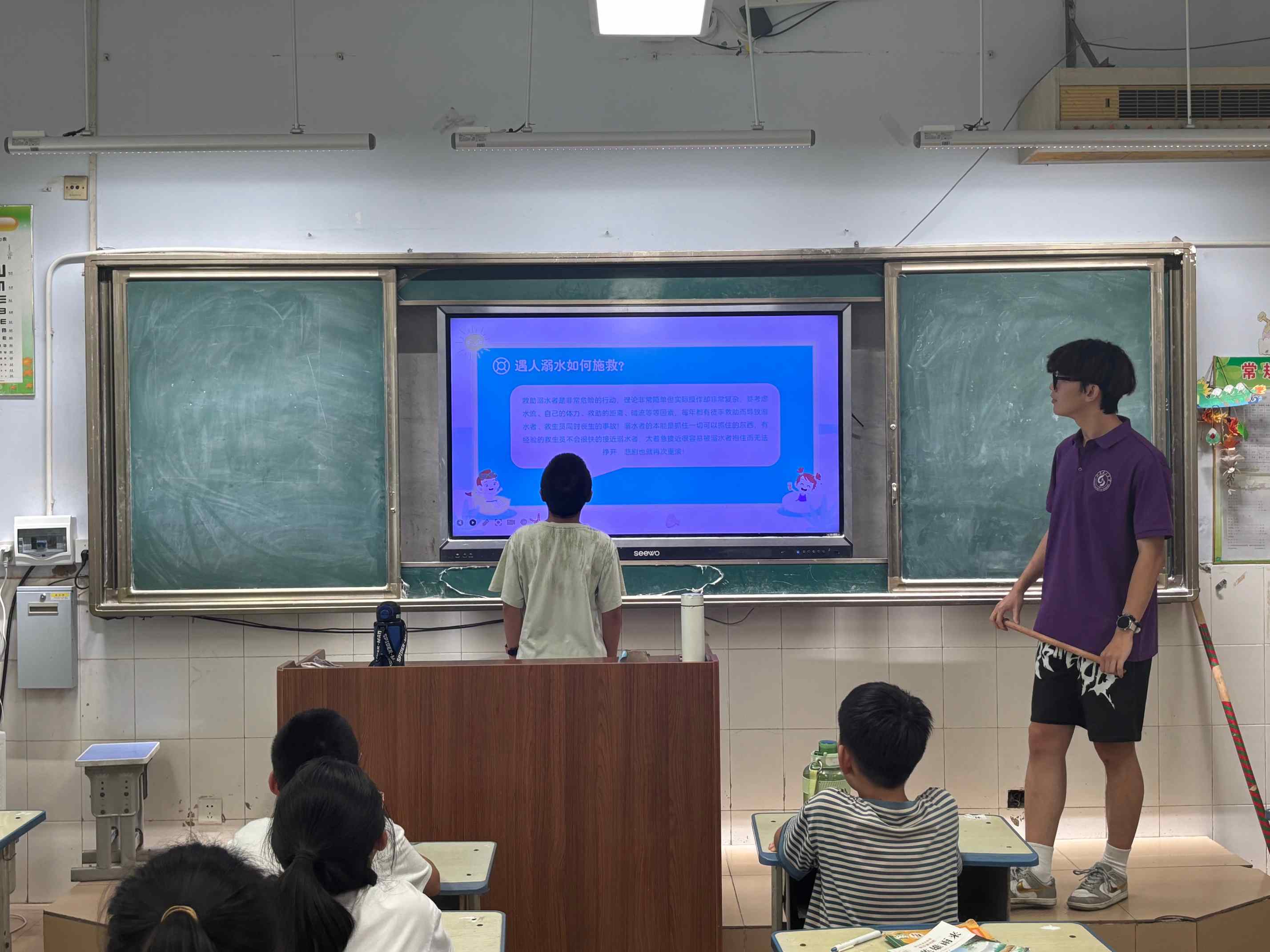 班会上,实践团成员为大家讲解了防溺水的安全知识,告诉同学们什么样的水域不能去游泳和玩耍,引导同学们去正规的游泳场馆。实践团成员们为小朋友们介绍了“六不一会”,即:不私自下水游泳;不擅自与他人结伴游泳;不在无家长或教师带领的情况下游泳;不到无安全设施、无救援人员的水域游泳;不到不熟悉的水域游泳;不盲目下水施救;学会基本的自护、自救方法。同时,实践团成员还结合真实案例,向同学们分享了多个溺水成功自救及科学施救的典型案例。通过实践团成员们对于防溺水知识的讲解以及对经典案例的介绍与分析,同学们对防溺水有了更深刻的理解和认识,为同学们的生命安全提供了更好保障。