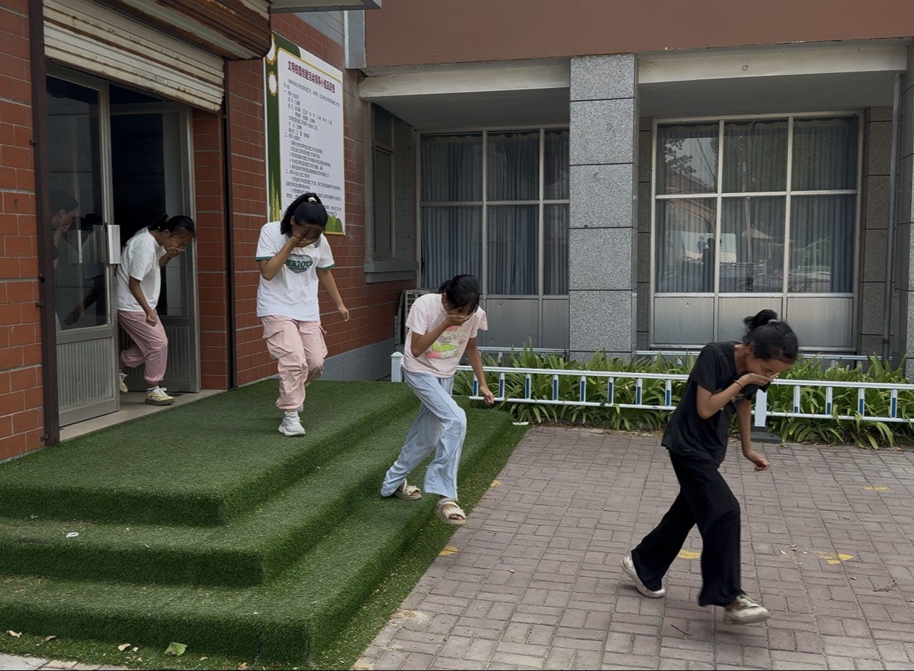 伴随着急促的警报声响起,消防演练拉开了序幕。在听到广播“现在进行消防演练,请同学们在老师的指挥下立即疏散”后,孩子们弯腰低头、捂住口鼻,有序向教室外的应急疏散地点跑去。实践团成员在确保教学楼内学生全部疏散后,再到达集合地点,实践团成员们迅速清点各班人数,并向实践团队长和学校领导统一汇报。