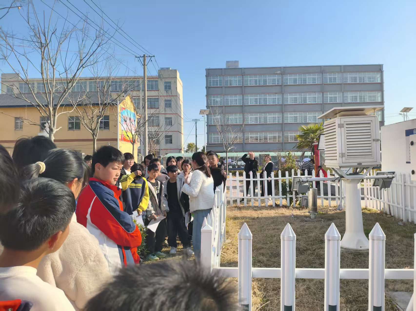 图为靳寨中学的同学们有序观摩气象测定设备 荣佩琪 供图