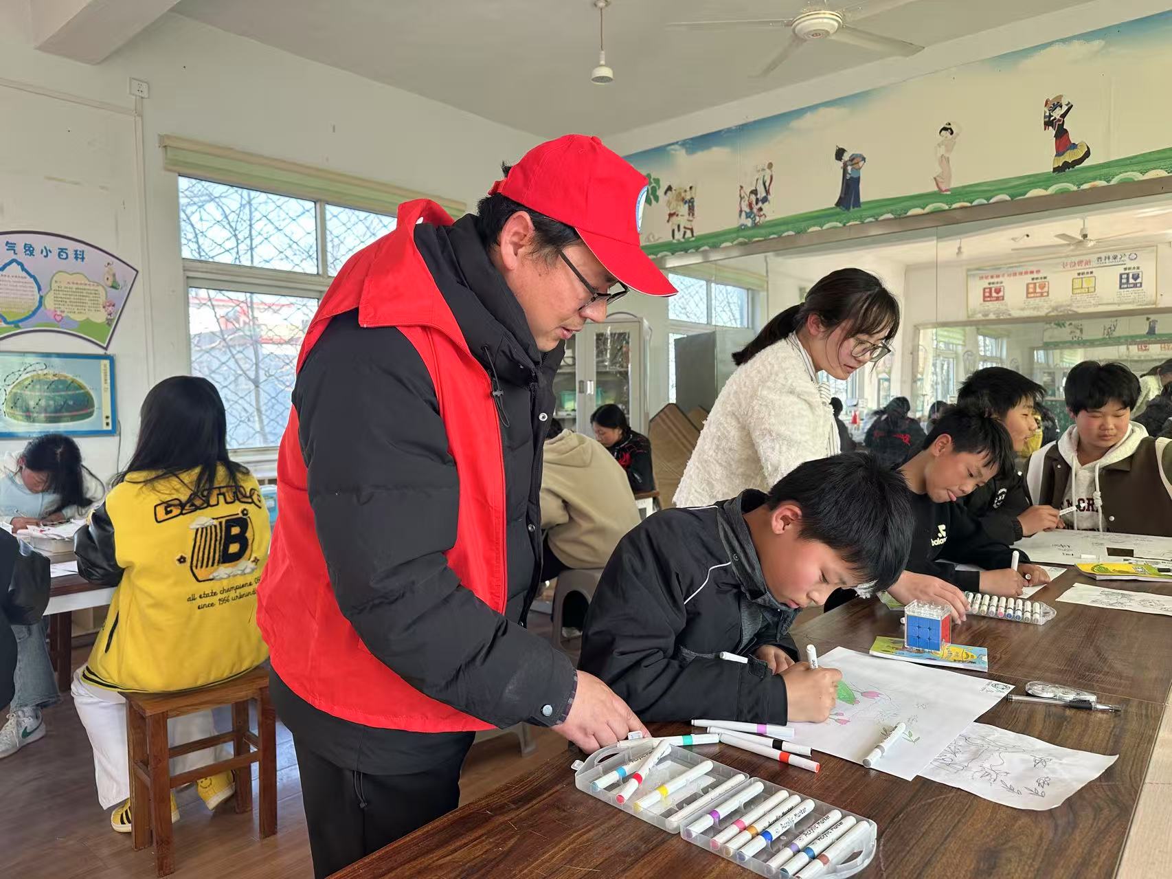 图为界首市阳帆志愿者成员协助学生作画 荣佩琪供图