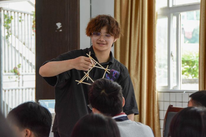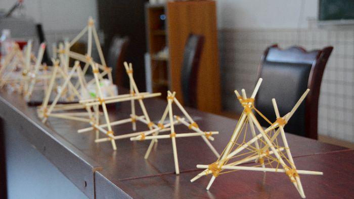 随后,老师向同学们介绍了龚滩古镇的吊脚楼建筑,并指导学生如何用筷子和橡皮筋制作模型,让同学们根据自身想象力,制作一个属于自己的模型。孩子们发挥自己想象力,做出了许多充满想象的作品。实践也带领孩子们认识到了吊脚楼的复杂,让孩子们理解了古人的智慧。