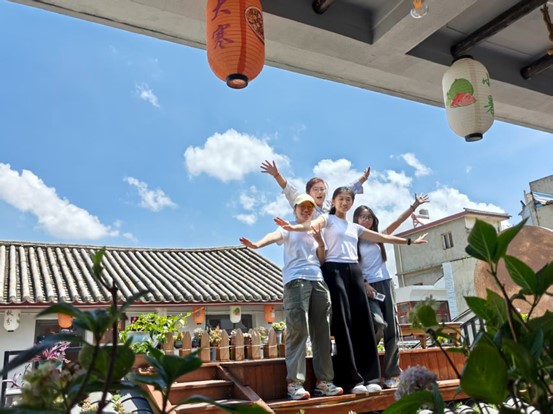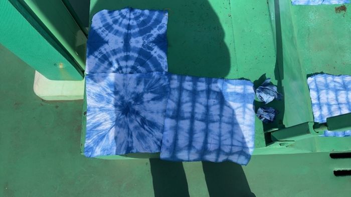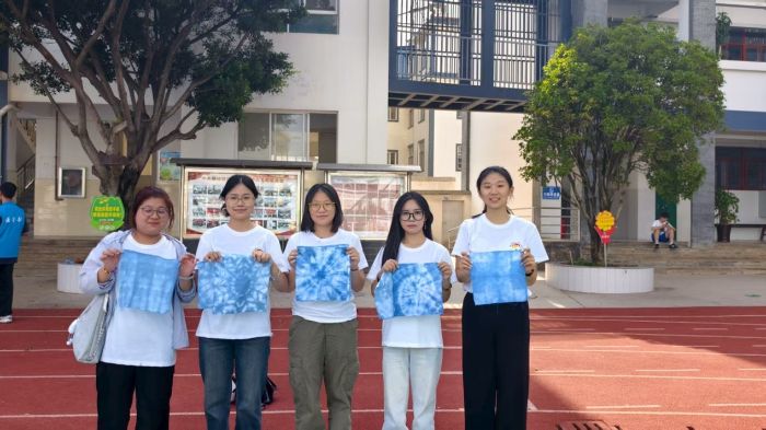天空很蓝,碧空如洗,没有一丝杂质,没有一星愁绪。雲川志愿者协会的志愿者老师们带领团队成员体验非遗手工的扎染。染液深得像一汪静止的湖,空气里有股淡淡的青草和靛蓝味,混着阳光下的热气,让人觉得很是深沉。团队成员在老师的教学下先折布、绑线,每一道褶皱和每一根线的位置,都会决定最后的花纹。布折好后,慢慢沉进染缸里。刚入水的时候,颜色几乎看不出来,只能看到液面微微荡起的涟漪。老师让把布在缸里翻动、浸泡,让靛蓝均匀渗进去。团队青年围在一旁,看颜色一点点渗进去,像看一朵花慢慢开放。绳子拆开,每一道褶皱都展开成意想不到的纹路,有的像湖面上的水波,有的像一片片白云飘在蓝天里。大家一边晾布,一边拿着成品互相展示,手上染上了淡淡的蓝色,就像带走了云南的一小片天空。