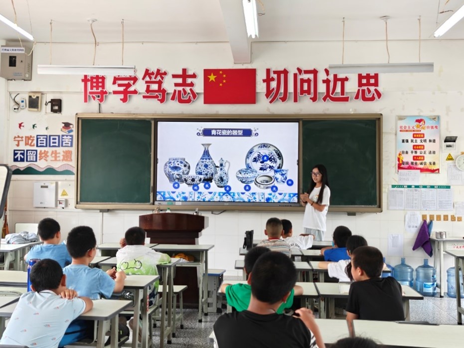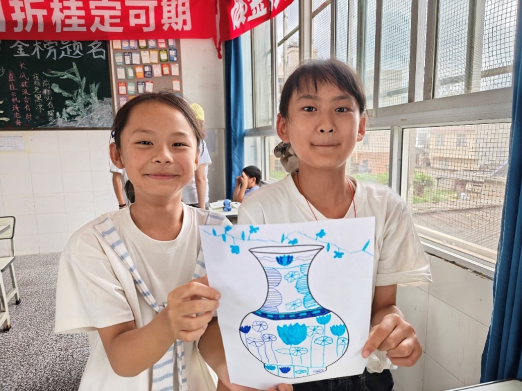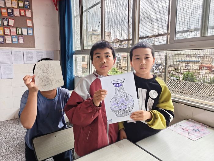 青花瓷上流淌的釉色,泛着温润的柔光。课堂上,实践团成员铺开素白画纸,将青花纹饰里藏着的故事娓娓道来。缠枝莲纹里藏着生生不息的祈愿,云纹间飘着古人对天地的敬畏,就连最简单的回纹,都绕着“富贵不断头”的吉祥寓意。孩子们手握画笔,专注描绘,青色的线条便随着专注一点点铺展。有的孩子模仿瓶身上的缠枝纹,线条歪歪扭扭却透着认真。当孩子们举着画纸露出雀跃的笑,阳光透过窗户落在画纸上,把蓝色的纹路映得愈发清亮。恍惚间,那些笔墨勾勒的图案仿佛活了过来,与孩子们眼里的光撞了个满怀。古老的手工艺从不是博物馆里的标本,只要有人愿意描摹、愿意倾听,它就能在现代的课堂上,重新长出鲜活的模样。