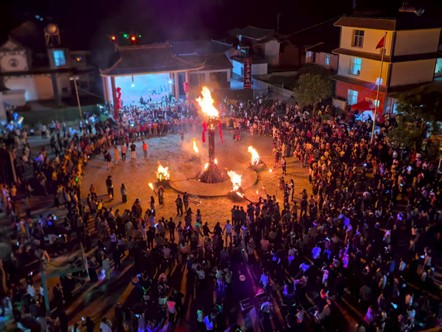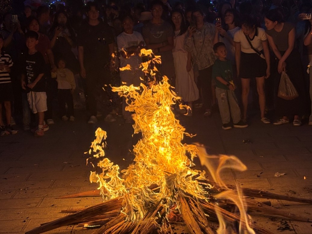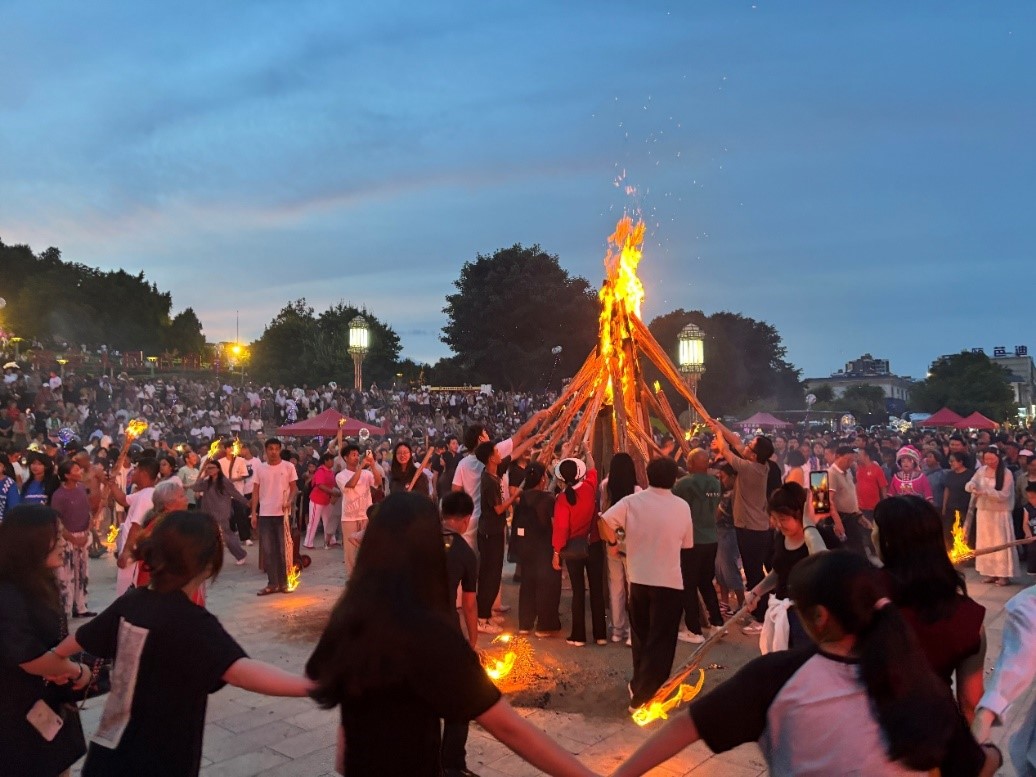 在祥云,火把节的热闹从下午就开始了。街上搭起了彩门,卖小吃的摊位排成一条街,油炸的香味和烤肉的香气混在一起。晚上八点,广场中央的篝火点燃,火光闪亮,把人们的脸映得红红的。当地人将火把递给团队的青年们,木柄在手里很沉,火焰在耳边劈啪作响。鼓声一响,人群舞动起来。团队成员与阿婆、本地老师、其他志愿者手牵得愈发的紧,笑声混着火苗的噼啪声,在夜色里飘荡得很远。热浪从脚底一直涌到额头,衣服上沾了烟火味。回到住处时,橙色的火光还在心中,越燃越旺。