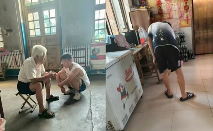 图二 一位同学帮小卖铺王奶奶打扫卫生另一位在陪韩爷爷聊天