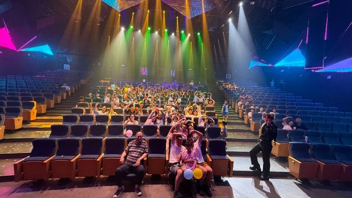 夜幕降临,奇幻魔术秀登场。舞台上,红裙舞者如火焰绽放,长矛穿铁盒却空无一物的表演引发现场惊呼;魔术师李凡的“读心术”,通过与孩子互动展现精准预判,令人称奇。压轴环节中,李凡分享画家梦想并展示手绘龙舟,随后巨大龙舟幻影出现,全场掌声雷动,既惊叹于魔术的奇幻,也为梦想的力量所感动。