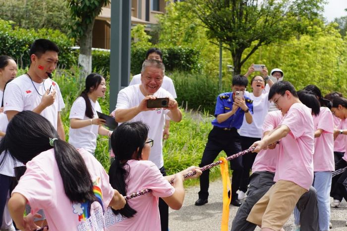 清晨,伴着晨光与露珠,“游艺运动会”拉开帷幕。“过河拆桥”竞速赛中,孩子们抱着硬纸板疾冲,虽有踏空小插曲,却更添竞技趣味;拔河比赛时,营员们紧攥麻绳,脚嵌泥土、身体后倾,汗水与呐喊交织,最终以胜利的欢呼定格瞬间。