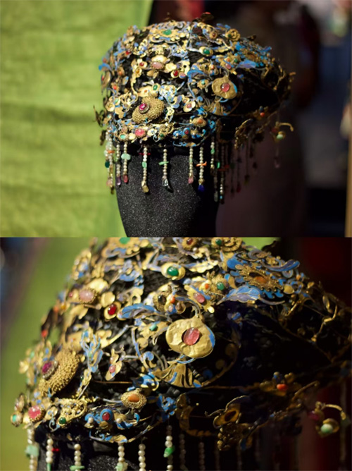 五、“黄河从草原流过,非遗希望永恒” 蒹葭苍苍,雄踞北疆,黄河西来,折而南流。8月8日团队成员魏晨烨同学去往内蒙古博物院考古这方古老而瑰丽的土地。下图中的文物为清代点翠凤冠,是清代点翠技艺等非遗智慧的结晶。其以翠鸟羽毛为材,工匠以精湛技术将羽毛贴于金属胎体,头饰呈现出的蓝绿色泽,正是清朝庄严典穆的朝代特征。