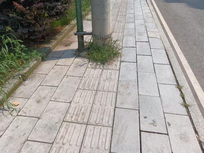 盲道有破损,且设计不合理有柱子占用盲道位置