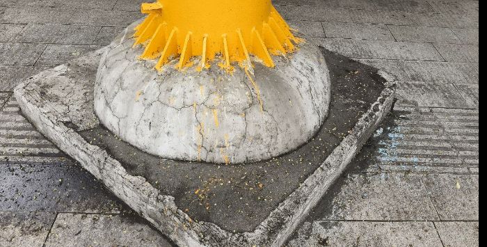 图为桃北中街五巷附近路段,盲道旁有一处电线杆水泥墩占道,对视障人士沿着盲道安全通行构成极大挑战。