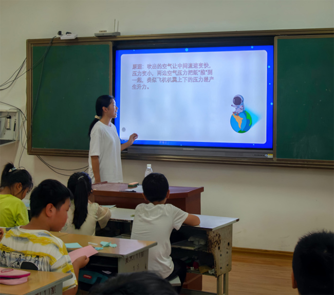 教育赋能:把“三航”课堂搬进乡村教室 依托南航“三航”特色,团队将“大国重器”拆解成孩子们听得懂的语言:C919大飞机变身“会飞的公交车”,北斗卫星化作“天空中的指南针”。实践团成员借助图文并茂的资料与精彩纷呈的视频,带领孩子们拆解机翼升力奥秘。“机翼上凸下平的奥秘,就像给空气一个向上的拥抱。”简单易懂的描述与极具冲击感的画面,恰似在平静湖面投下一颗石子,激起层层探索的涟漪,激发了孩子们对航空世界的想象。