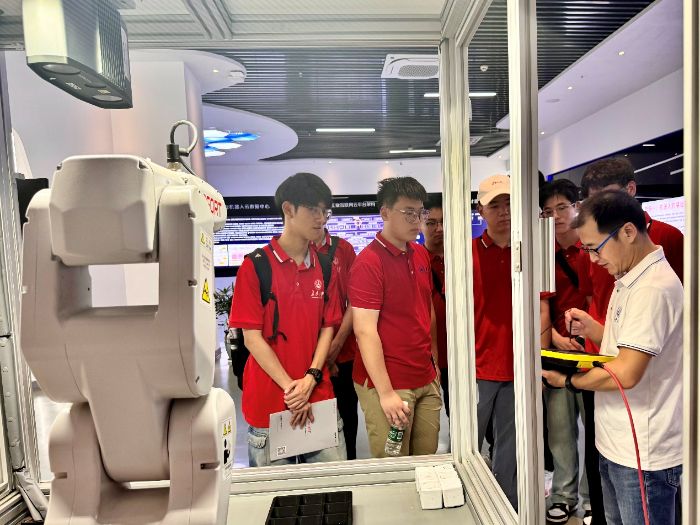 实践队深入生产一线,在语音交互智能码垛工作站前进行深度技术观摩。郭万金老师结合现场全场景实操,详细解析了从语音指令识别、机械臂运动学实时解算到末端执行器精准抓取与排列的全流程。队员们近距离观察了机械臂的流畅运行轨迹与稳定抓取性能,这正是“翼臂协净”项目实现清洁作业臂精准控制与高效执行所追求的核心能力。这种沉浸式体验,使项目团队对“指令-规划-执行”这一复杂链条中的关键环节(尤其是运动控制算法和实时反馈系统)有了更为直观和深刻的理解,为优化项目技术路径提供了直接启发。