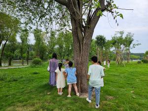 户外实践活动被设计成一次有趣的“探险寻宝”之旅。前往宝应中学,队员们设置了“校园发现任务卡”,让孩子们以小组为单位,去寻找最有特色的建筑、最安静的读书角、最热闹的运动场,并在过程中感受大学校园的独特气质。在大运河风光带,历史讲解变成了“运河密码破解”游戏。在运河畔的草地上,孩子们用落叶、花瓣、树枝等自然材料创作大地艺术。有的拼成运河帆船图案,有的制作植物标本画,有的搭建微型水利工程。在这个过程中,实践成员穿插讲解环境保护知识,让孩子们在体验中树立生态意识。实践成员提前将运河的历史知识、地理特征设置成小问题,孩子们需要仔细观察雕塑、碑文、甚至植物来找到线索和答案。河风拂面,绿柳成荫,知识在奔跑、寻找和协作中被轻松习得,爱家乡的情感也在这快乐的游戏中悄然生根发芽。