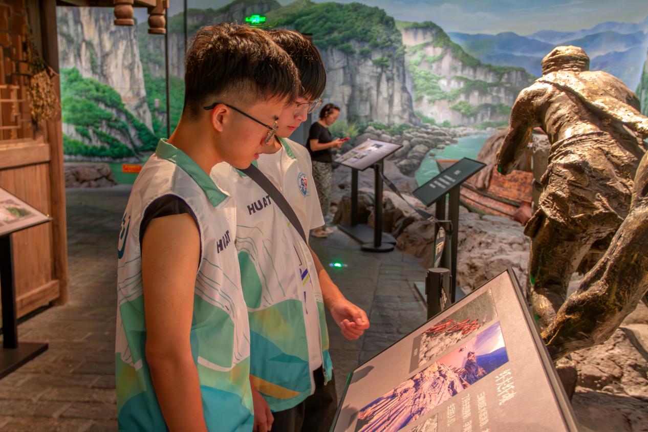 图为团队成员学习三峡纤夫的历史,团队成员看着三峡纤夫的雕塑,感受到三峡纤夫的艰辛与坚韧交织,是对生存的抗争,也是对自然的敬畏。王禹宸通讯员摄