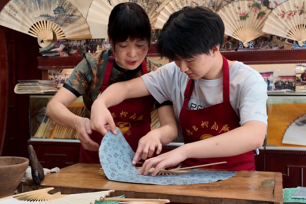 在荣昌折扇厂,通过老照片与史料,团队了解到折扇从清乾隆年间民间小手作,到民国时期成为“川中三绝”,再到新中国成立后创新发展的历程,学习了其“薄如纸、轻如羽、透如纱、亮如瓷”的“四绝”特点及背后工艺。在重点体验“表糊扇面”工序时,在老师的示范与指导下,成员们上手实践,深刻体会到了非遗传承过程中的专注与严谨。