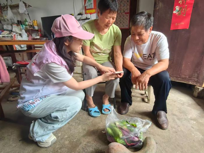 7月31日上午,团队成员走进天马镇街巷,与售卖蔬菜的农户、制作豆腐的阿婆交流,用手机记录当地方言与民风。随后跟随农民深入田间,了解玉米、茄子、丝瓜等农作物的种植流程。一位农民介绍了应对暴雨和病虫害的传统方法,如用辣椒水驱虫、加固支架防倒伏等,体现了传统农耕智慧与现代经验的结合。团队成员参与农产品装袋,体验劳作与收获过程。期间,志愿队同步开展民族文化宣传,向农户发放民族知识手册,介绍各民族传统节日、饮食文化等内容,讲解民族团结相关政策,增进农民对多民族文化的认知。