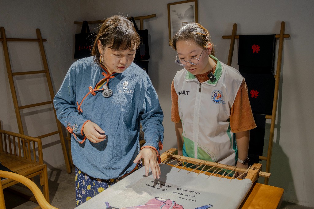 图为乔贵荣老师向队员们展示三闾刺绣的刺绣手法 王禹宸 供图
