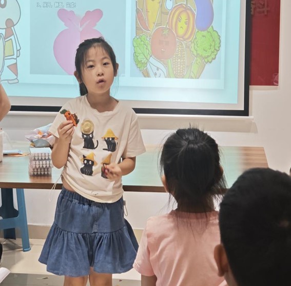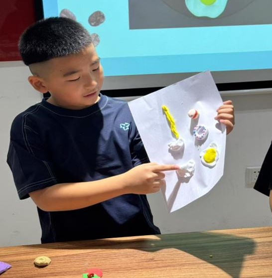 在活动中,志愿者围绕健康饮食主题,分阶段开展了早餐、午餐、晚餐系列教学:通过图文PPT为孩子们讲解三餐的定义、历史演变、文化传统、营养价值及科学搭配原则,帮助建立健康饮食基础认知;互动环节借助趣味小游戏让孩子们在轻松氛围中理解三餐重要性,同时选取《肚子里有个火车站》《汉堡男孩》《我不挑食》等经典绘本,将“细嚼慢咽、不挑食、均衡饮食”等科学理念融入故事讲述,引发热烈讨论;手工与艺术创作环节中,孩子们动手制作三明治、牛奶等黏土模型,在纸扇上描绘喜爱的水果蔬菜,在实践中深化了对合理膳食和健康饮食的理解。