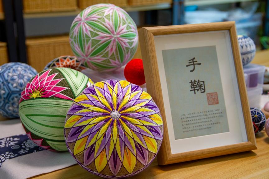 推开工作室的门,仿佛进入了一个充满诗意的艺术空间。阳光透过窗棂洒在陈列架上,各式手鞠作品在光影交错中泛着温暖的光泽。这种"家即是工作室"的独特布局,营造出温馨亲切的艺术氛围,让人瞬间感受到传统与现代交融的美妙意境。工作室内陈列着十余项非遗作品,宛如一个小型非遗博物馆,其中最引人注目的是那些大小不一、色彩斑斓的手鞠作品。