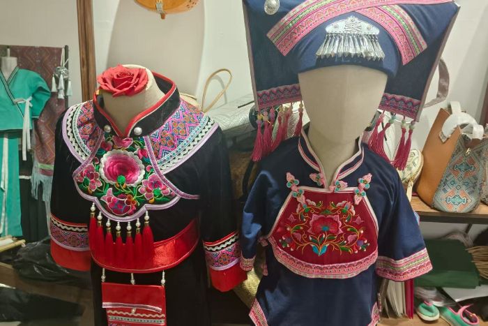 实践期间,志愿队以萨玛非遗生活馆为重要调研阵地,对传承人洛尘老师展开深度采访。洛老师为柳州市非物质文化遗产项目侗族大歌第五代传人、萨玛非遗生活主理人,在民族文化传承领域积累了丰富经验。交流中,志愿队成员围绕壮族服饰展开细致探究,从款式色彩的搭配逻辑到装饰纹样的文化隐喻,深入挖掘“稻穗纹”象征丰收祈愿、“蝴蝶纹”承载民族创世记忆与感恩自然等文化内涵。洛老师同时分享了壮族服饰背后的民间传说:古代壮族先民借衣襟纹样传递御敌信息,形成“密码式”刺绣;百褶裙褶皱数量与女子勤劳程度挂钩,使服饰成为民族精神的鲜活载体。通过交流,成员对服饰与民族历史、信仰的深层联结形成认知。