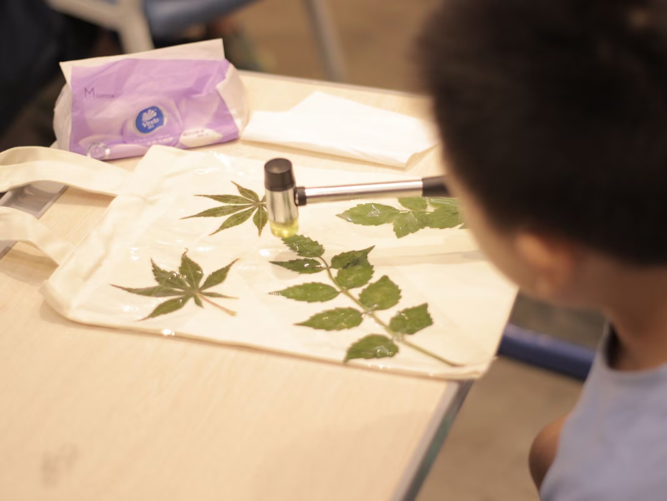 活动伊始,实践队员们首先为孩子们生动讲解了植物拓印的历史渊源和制作技巧。在实践环节,小朋友们兴致勃勃地挑选自己喜爱的花叶,在队员们的悉心指导下,通过敲打、按压等方式,将植物的自然纹理完美地拓印在帆布包和手帕上。每一件作品都呈现出独特的自然印记,展现了植物最原始的美感。