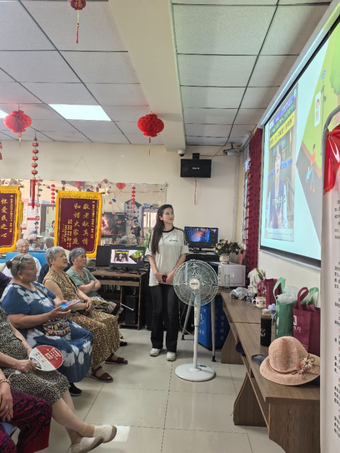 活动开始时,实践队成员考虑到老人们的理解能力和接受程度,采取通俗易懂的语言和丰富多样的形式展开讲解。他们先通过一段精心制作的视频,展示了一键报警装置在实际紧急情况中发挥的关键作用。随后,宣讲人潘钰婷结合PPT,详细介绍了一键报警装置的功能和应用,同时指出一键报警装置在生活中其实很常见,银行ATM机旁、无障碍卫生间、地铁上……都有它的身影。潘钰婷还通过实例讲解,让老人们更加直观地理解了一键报警装置的重要性。