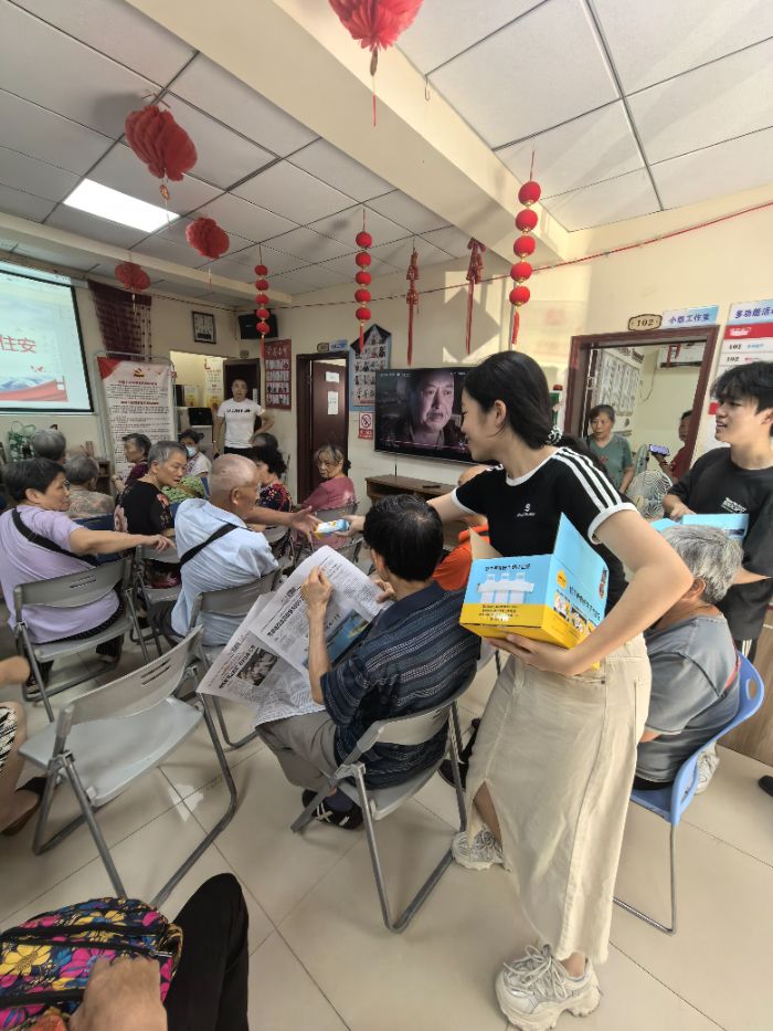 为了增强互动性,实践队特别设置了问答环节,鼓励老人们积极提问,分享自己在一键报警装置的所见所闻。其中一位老人分享到“见过,但是没按过。”现场气氛热烈,老人们纷纷表示受益匪浅。